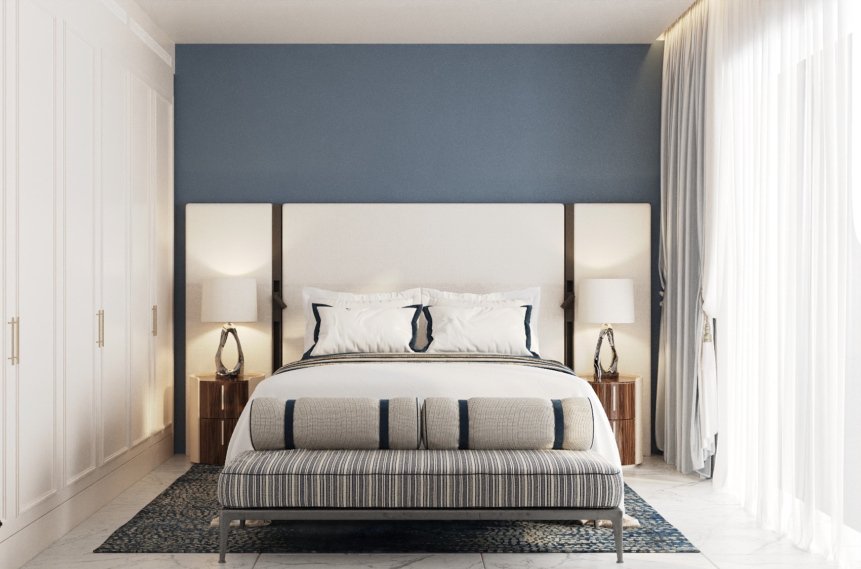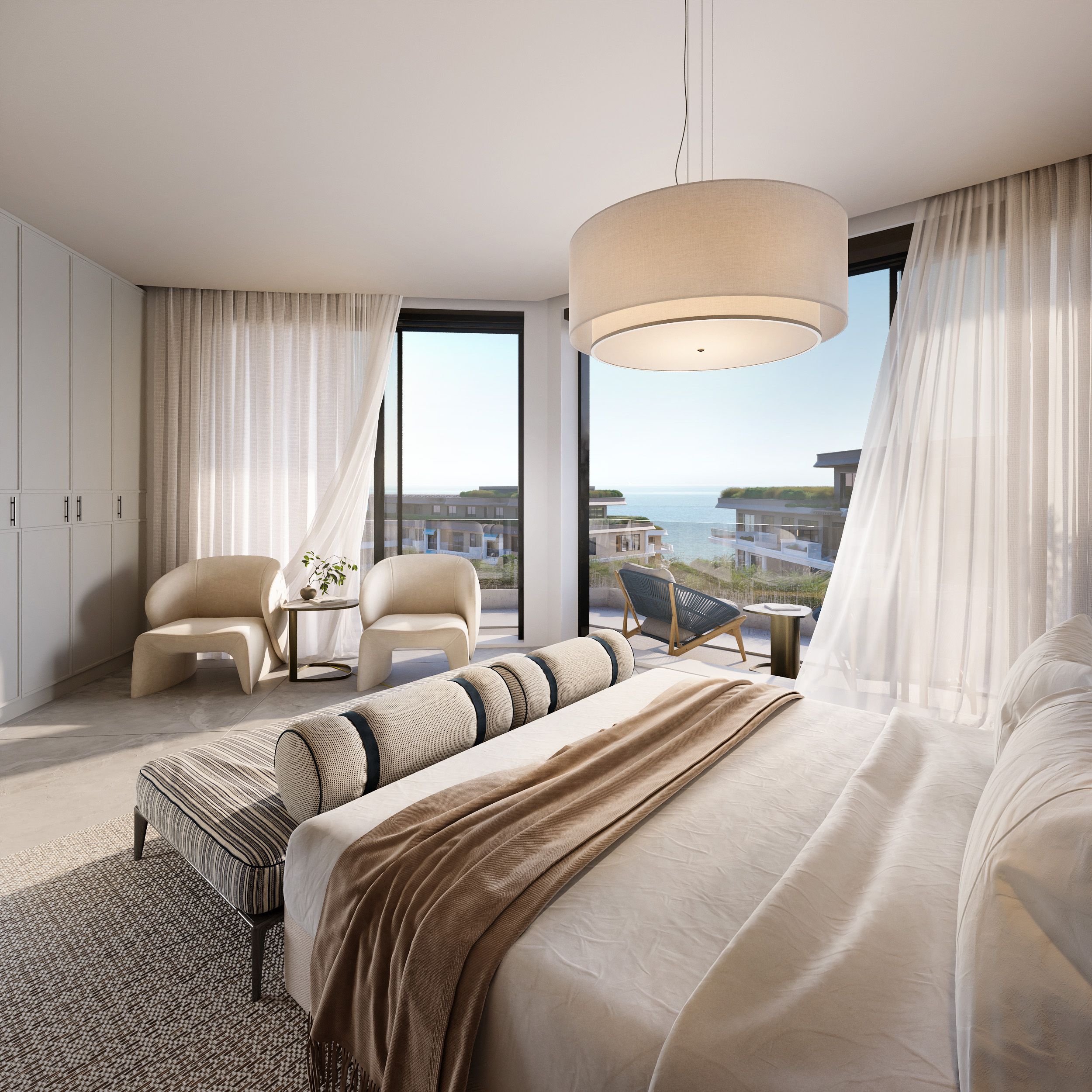 Clean lines, expansive glass façades, and terraces opening toward the sea create a seamless connection between the interior and exterior.